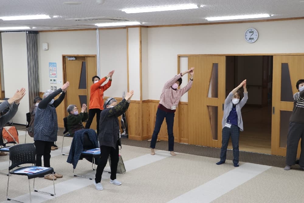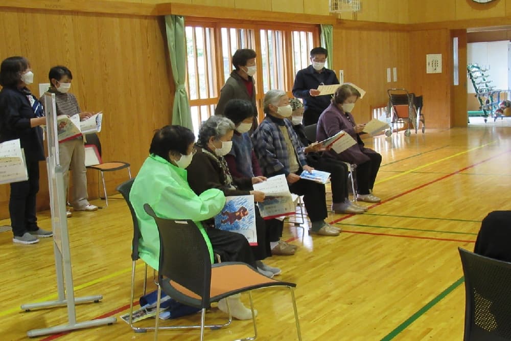 いきいきサロンは、平成16年6月から始まりました。公民館で毎月1回、第4週の火曜日を予定しています。会員は、区内の高齢者の中で20~30名程度の参加をいただいています。内容は、月により、ぬり絵・朗読・演奏・体操・脳トレなどで健康増進を行っています。春や秋にはバスの日帰り旅行など、野外活動を計画しています。